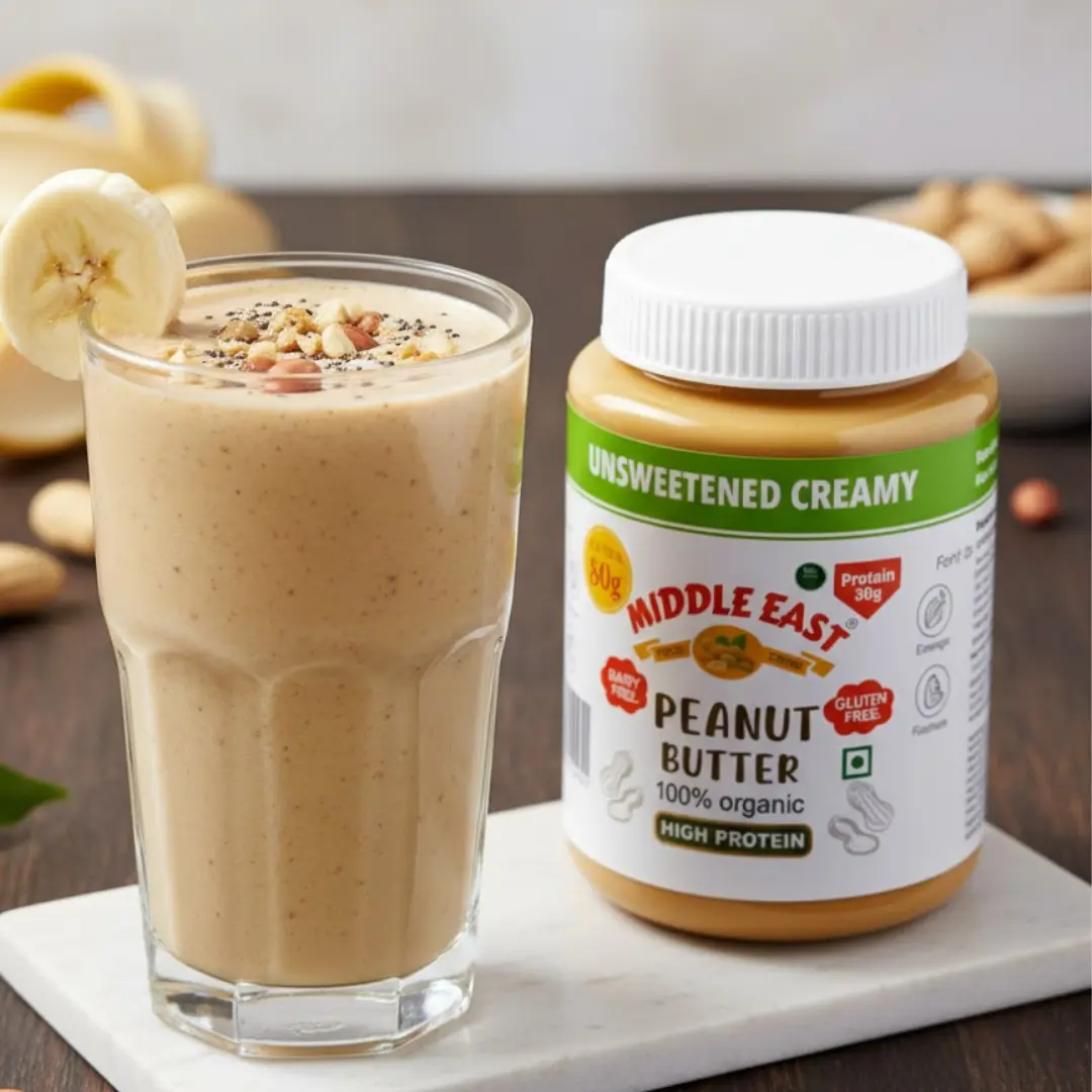 Ingredients: 1 ripe banana 1 tbsp Middle East Peanut Butter (any flavor you love!) 1 cup chilled milk or almond milk 1 tsp honey (optional) A few ice cubes