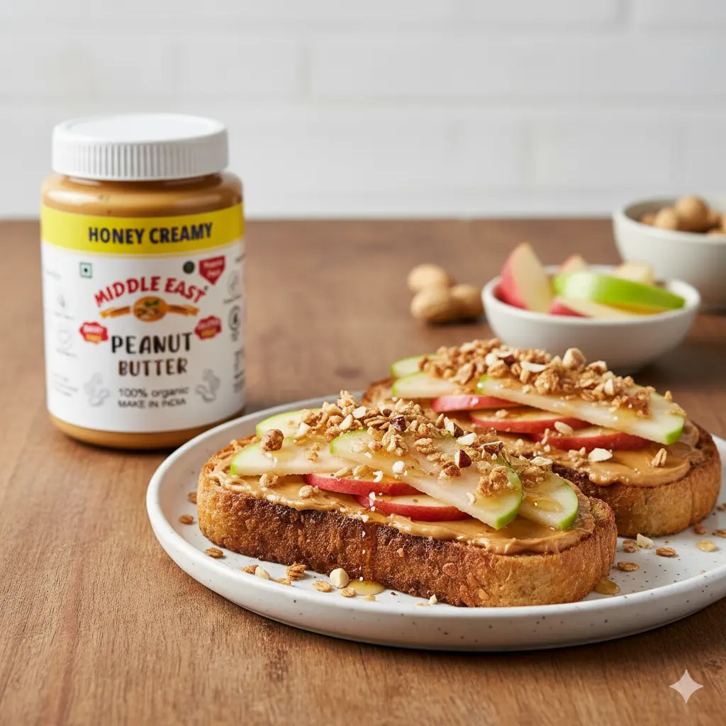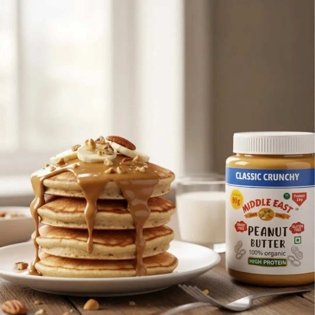 Method: Blend everything into a smooth batter, pour onto a heated non-stick pan, and cook both sides golden brown. Drizzle Middle East Honey Creamy Peanut Butter on top.