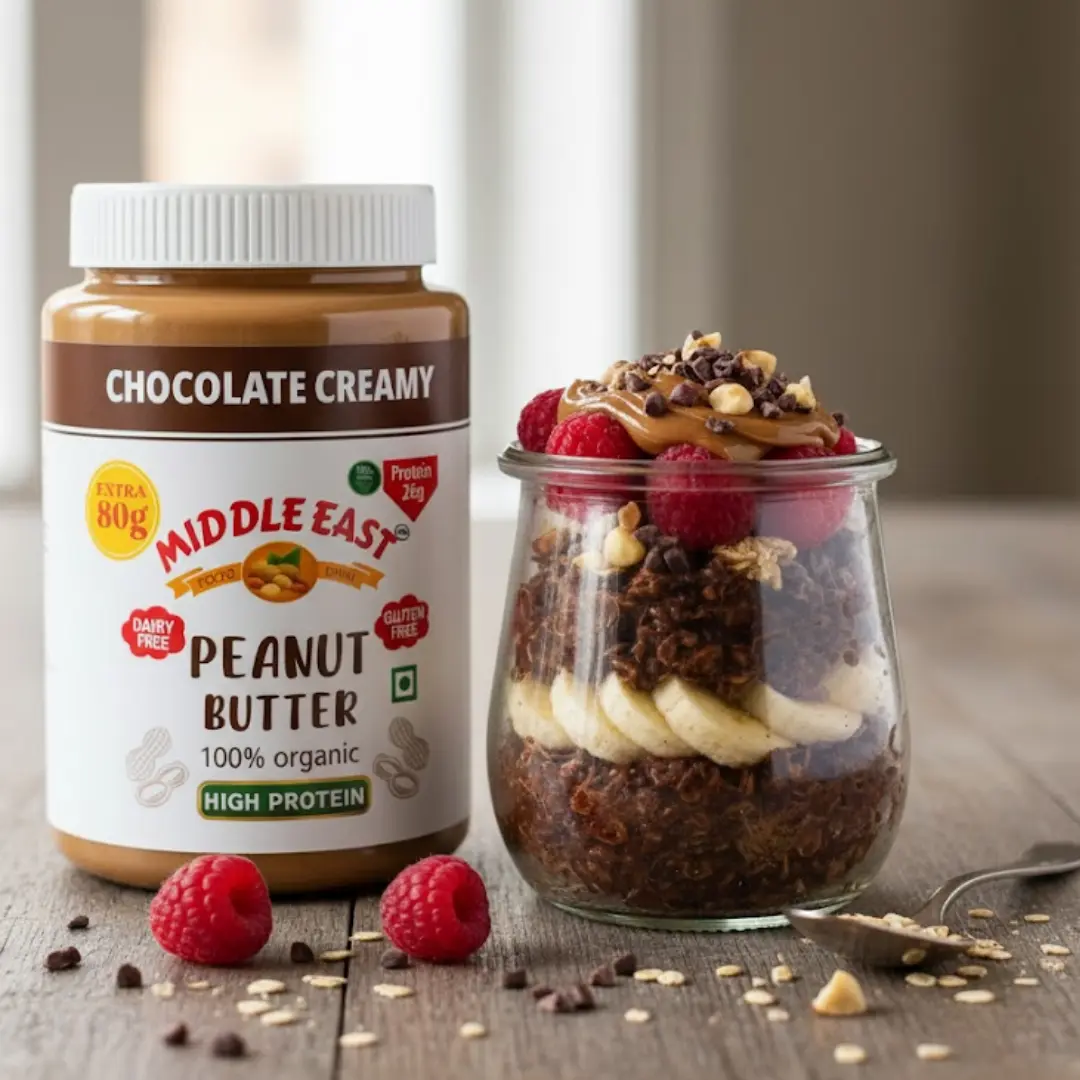Ingredients: ½ cup rolled oats 1 cup milk or yogurt 1 tbsp Middle East Dark Chocolate Peanut Butter 1 tsp chia seeds Toppings: banana slices, cocoa nibs, or almonds